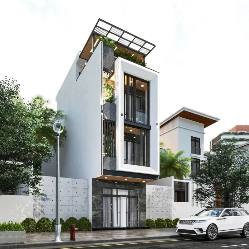 Mẫu nhà phố 3 tầng hiện đại nổi bật với kiến trúc vuông vức, mặt tiền thoáng đãng và điểm nhấn mảng xanh tươi mát. Thiết kế chú trọng không gian mở, tận dụng ánh sáng tự nhiên và gió trời để tạo sự thoải mái. Đây là giải pháp lý tưởng cho gia đình trẻ yêu thích phong cách sống năng động và tiện nghi.